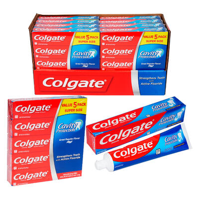 Colgate cavity protection toothpaste is ideal for keeping teeth clean and cavity free. It comes in a pack of 5 8oz toothpastes. It's made from top brand Colgate. It's ideal for supermarkets, convenience stores, pharmacies and other businesses that sell dental care.